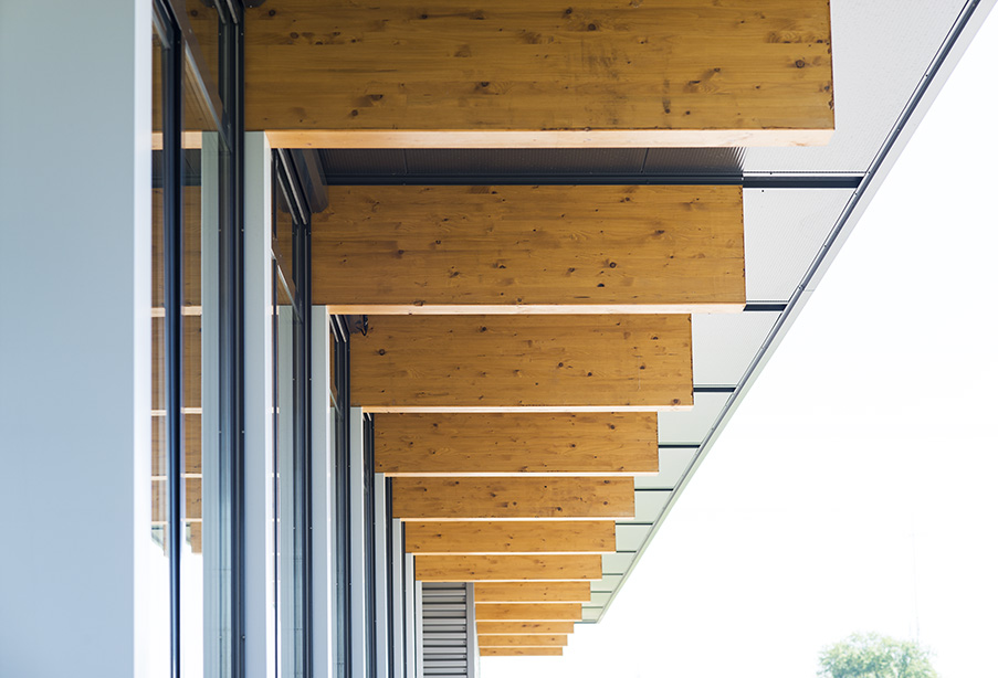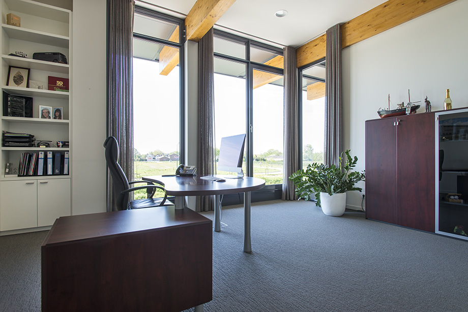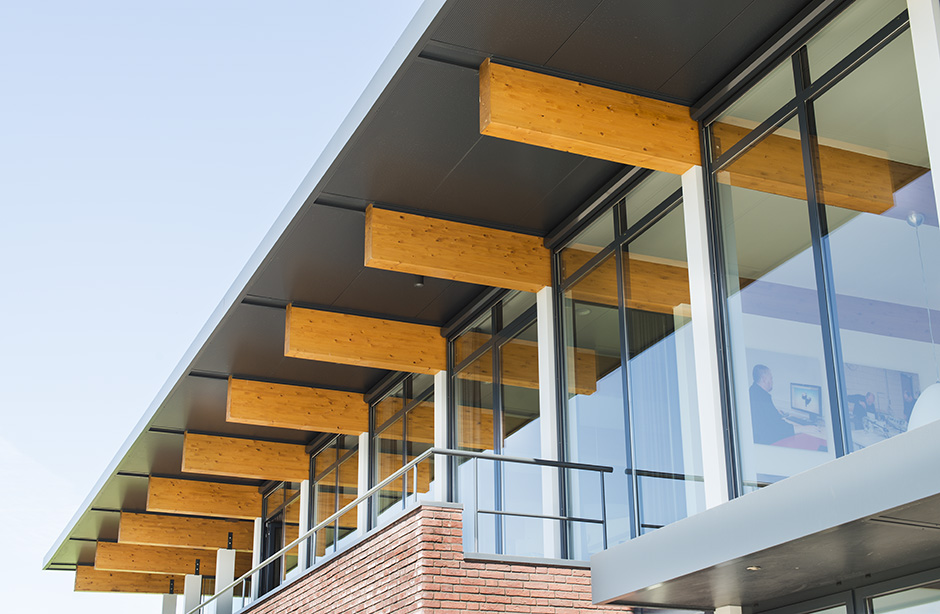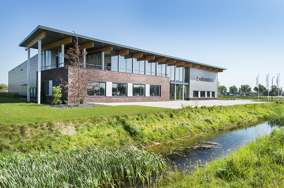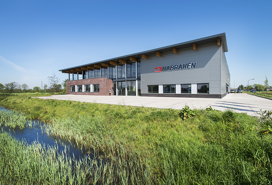 Voor Habraken Machines hebben we dit bedrijfspand ontwikkeld in Kaatsheuvel. De vormgeving wordt grotendeels bepaald door de drie hoofdfuncties en de oriëntatie. De zuidgerichte voorgevel wordt in de warme zomermaanden van schaduw voorzien door de 2 meter uitstekende gelamineerde houten balken. De kantoren, showrooms en opslagruimte zijn in de gevels herkenbaar als verschillende massa's.